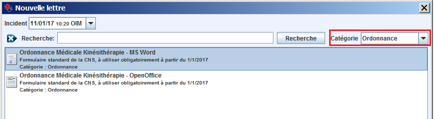 Wenn Sie bereits viele verschiedene Briefvorlagen benutzen, sollten Sie zusätzlich zum Titel auch eine Kategorie angeben, z.B. “Ordonnances”. Damit lässt sich die Liste der Briefvorlagen schnell und einfach filtern, wie hier gezeigt.
