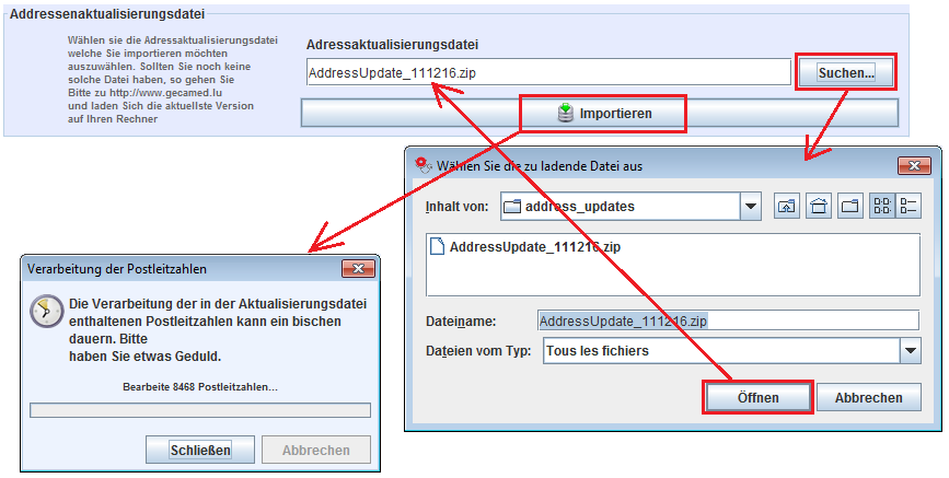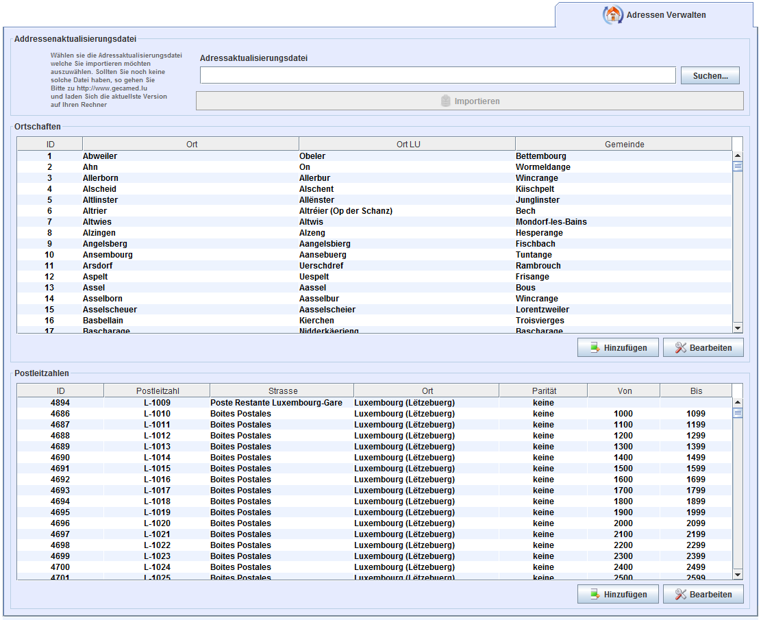 Wie in der Anleitung zu den notwendigen Initialisierungen bereits erwähnt gibt es eine Funktion zum Importieren der Luxemburger Adressen. Die dazu nötigen Daten stammen aus einer Adressen-Datei, die bis einschliesslich 2011 von den P&T zur Verfügung gestellt wurde, und in einem für GECAMed benutzbaren Format von uns zur Verfügung gestellt wird.