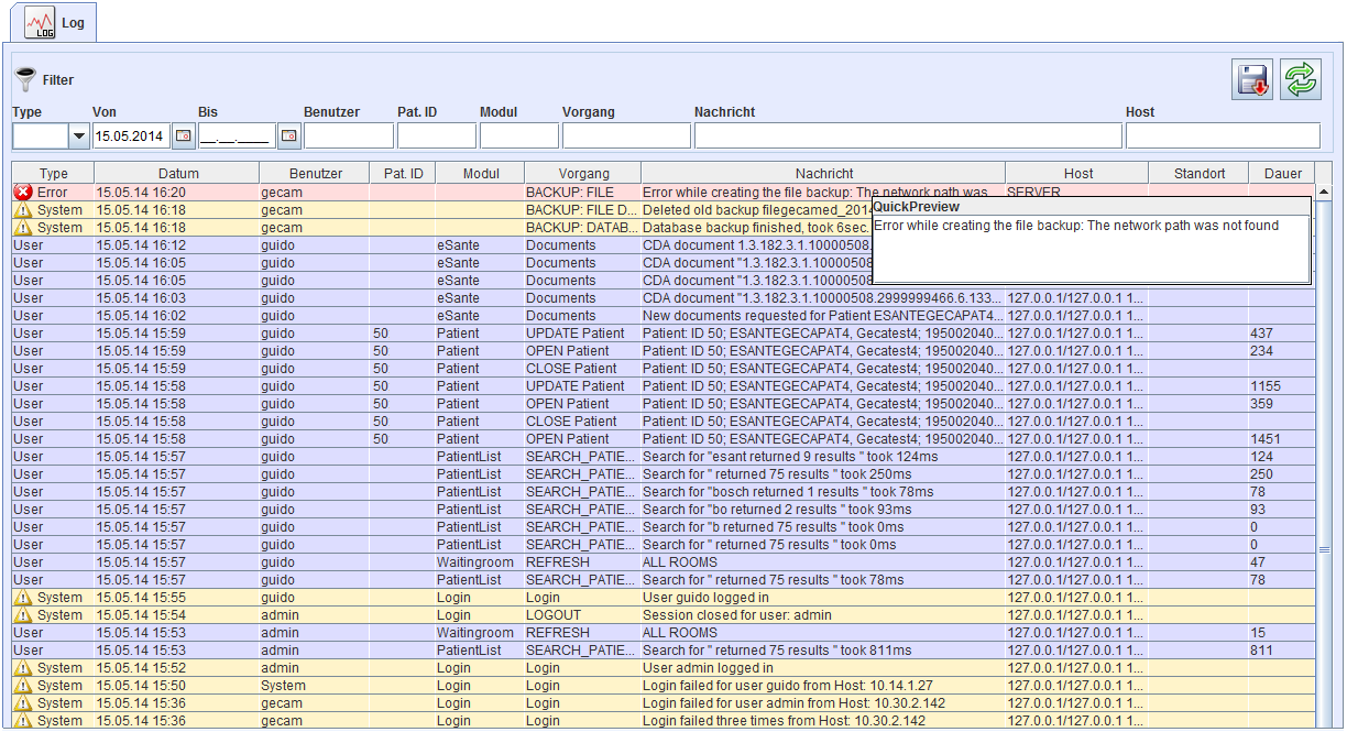 | Typ | Log-Einträge werden grob in 4 Typen / Klassen aufgeteilt: Error - Fehler die im Systembetrieb aufgetreten sind, wie z.B. fehlgeschlagene Client-Server Anfragen, Java-Messaging Excpetions (JMS), Backup Probleme usw. User - Von „normalen“ Benutzern ausgeführte Aktionen wie Patientensuche, Patienten öffnen/modifizieren/schliessen, Rechnung erstellen usw. System - Aktionen die automatisch vom System ausgeführt werden (Ausnahme: login / logout) Admin - Ursprünglich vorgesehen zum Loggen der Aktionen, die besondere Admin-Rechte erfordern. Wird aber aktuell nicht verwendet. |