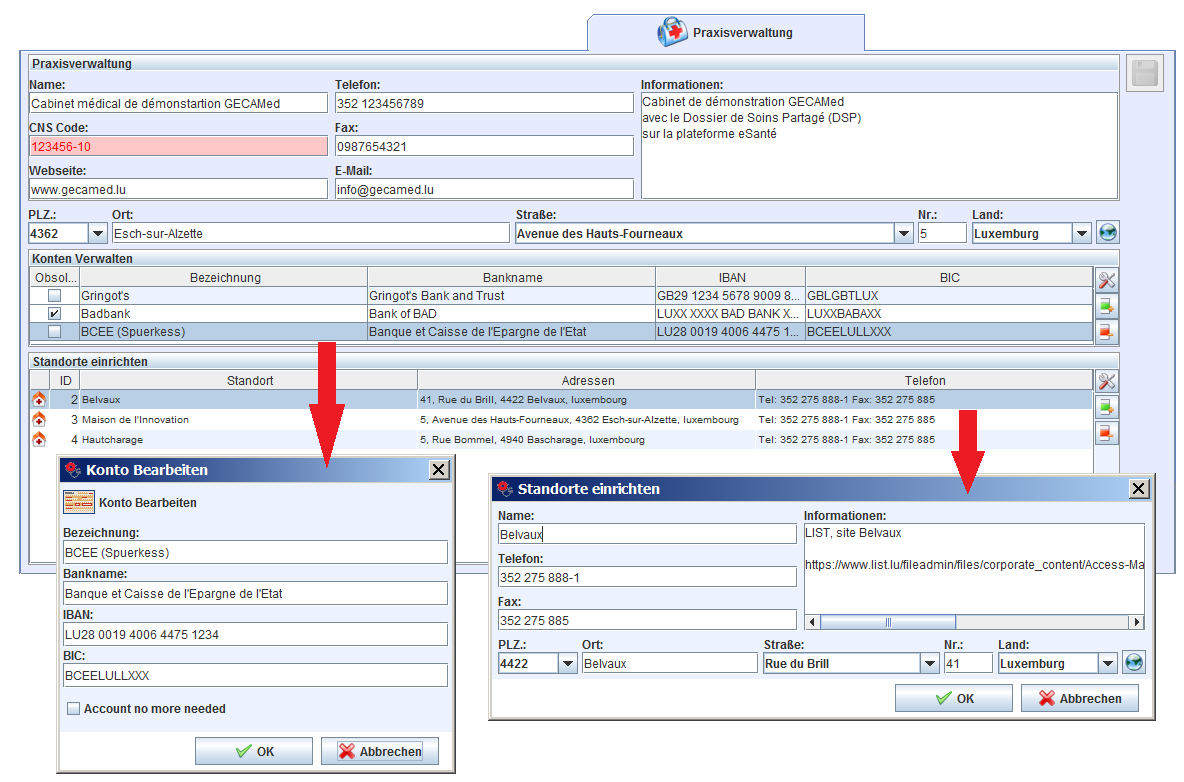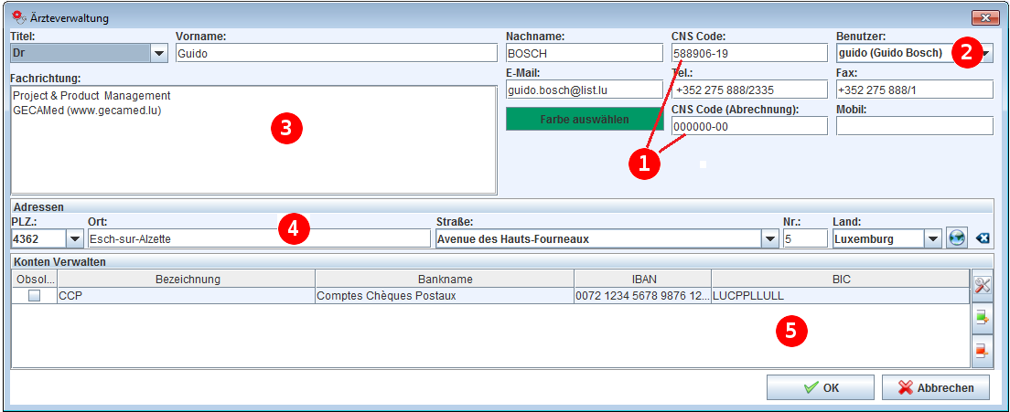 Wenn es sich dabei um Luxemburger Adressen handelt unterstützt GECAMed automatische Vervollständigung und Listenauswahl. Desweiteren können die Luxemburger Adressen auch direkt gepflegt werden.