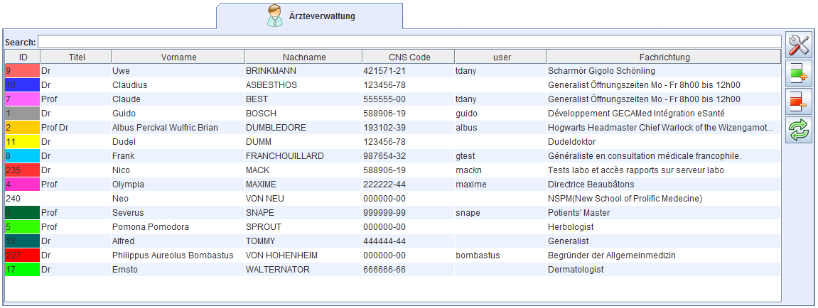 Sie finden dort die Liste aller Ärzte, die in Ihrer Praxis arbeiten. Jeder hier eingetragene Arzt erscheint in der Arzt-Auswahl in der rechten unteren Ecke von GECAMed (siehe weiter unten).