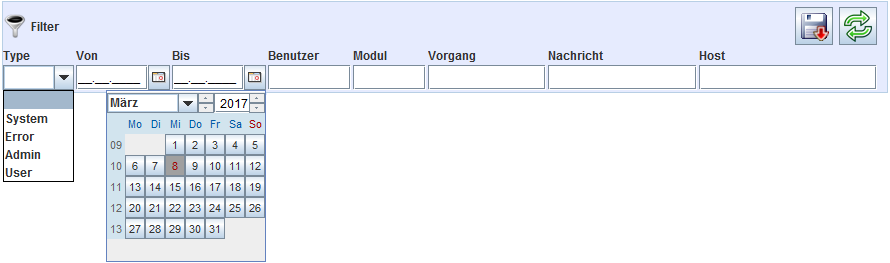 Durch das Erfassen von Filterkriterien und anschliessendes Neuladen der Protokollnachrichten mit der Schaltfläche „Neu Laden“ wird der Inhalt der Tafel neu berechnet, so dass nur noch solche Einträge zu sehen sind, die den Filterkriterein entsprechen. Es werden insgesamt immer nur die zeitlich letzten maximal 5000 Einträge gezeigt.