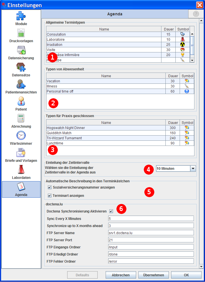 | Falls sie die Terminsynchronisierung mit doctena.lu nutzen wollen, aktivieren sie diese bitte durch Anklicken der Checkbox „Doctena Synchronisierung aktivieren“. Nun können sie einstellen, wie oft GECAMed ihre Daten automatisch mit doctena.lu abgleicht und für welche zukünftige Periode die von Ihnen bereits vergebenen Termine bei doctena.lu als nicht verfügbar erscheinen. Alle weiteren Einstellungen bezüglich des doctena Servers und dessen Optionen sollten nur auf Anweisung von doctena geändert werden. Weitere informationen finden sie unter Doctena Integration. |