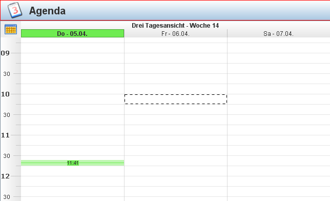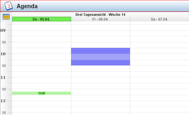 Die Drei-Tagesansicht stellt den aktuellen Tag und die beiden darauf folgenden dar. Ideal wenn Sie eine gute Darstellung der heutigen Termine benötigen, aber trotzdem die nachfolgenden Tage noch im Blick behalten wollen.
