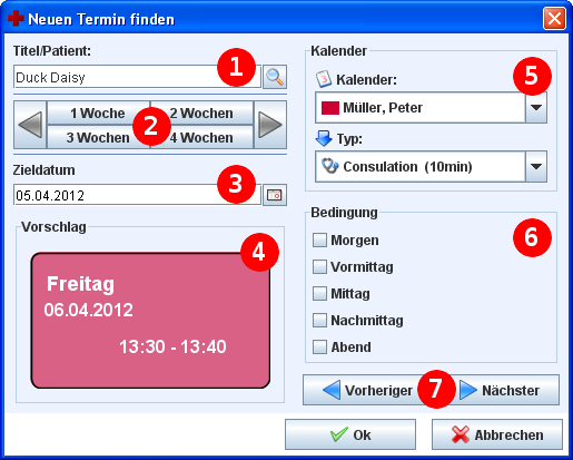 Wenn Sie die Schaltfläche 'Neuer Termin vorschlagen' betätigt haben öffnet sich ein Fenster, in dem Sie nach einem freien Termin suchen können (Abbildung 6). Die Funktion kann auch aus dem Patientenmodul heraus gestartet werden, wobei dann ein Termin für den aktuellen Patienten gesucht wird. In dem sich öffnenden Dialogfenster gibt es verschiedene Kriterien, mit denen Sie nach einem neuen Termin suchen können.