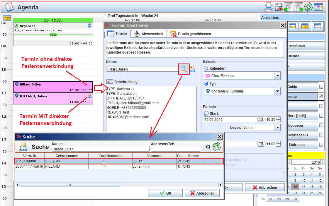 Zusätzlich zum Namen des Patienten werden weitere von doctena übertragene Daten (Geburtsdatum, Email, Telefonnummer) im Termin mit aufgenommen. Diese können dazu genutzt werden, den Termin einem existierenden GECAMed Patienten zuzuordnen oder einen neuen Patienten anzulegen.