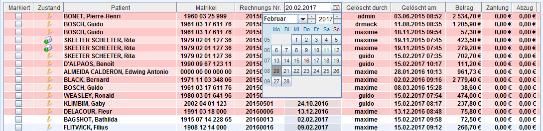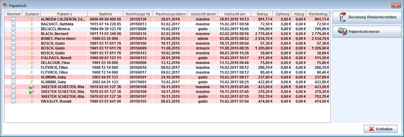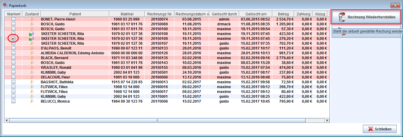 Die Liste aller sich im Papierkorb befindenden Rechnungen wird angezeigt. Neben den eigentlichen Rechnungsdaten werden noch der Name und die Matrikel des Patienten angezeigt sowie das Datum und der Benutzer, welcher die Rechnung ursprünglich gelöscht hat. Um die wiederherzustellende Rechnung leichter finden zu können, bietet der Papierkorb die Möglichkeit, nach Rechnungsnummer bzw. Rechnungsdatum zu suchen.