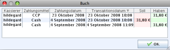 In diesem Beispiel wurde die Rechnung zunächst am 4.9.2008 als Cash bezahlt verbucht. Am 23.10.2008 wurden dann aber offensichtlich entdeckt, dass es sich um eine Fehlbuchung handelte, weil die Rechnung inzwischen per Überweisung beglichen wurde (CCP). Daraufhin wurde die Cash-Zahlung storniert und die Rechnung anschliessend nochmal per Überweisung verbucht.