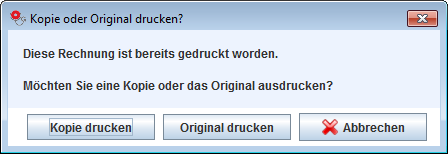 Auch ändert sich die Beschriftung der Drucken Schaltfläche zu Kopie drucken, da bei einem erneuten Druckauftrag nicht mehr das Original, sondern eine Kopie der Rechnung gedruckt werden soll. Dies wird auch auf dem Rechnungsausdruck explizit als „COPIE CONFORME À L'ORIGINAL“ angezeigt. Da aber einige Krankenkassen auf einem Original bestehen, gibt es weiterhin die Möglichkeit, beim erneuten Ausdruckemn zwischen einem Original und einer „copie conforme“ zu wählen (siehe Abbildung 12)