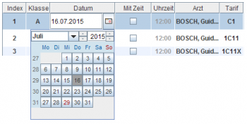 Um das Ausführungsdatum einer Leistung nachträglich zu verändern klicken Sie mit der linken Maustaste in das Datumsfeld. Sie können entweder mit der Tastatur ein neues Datum eingeben, oder einen Kalender zur Hilfe nehmen indem Sie auf die kleine Schaltfläche rechts vom Datum klicken (Abbildung 4). Beenden Sie die Eingabe mit der TAB Taste.