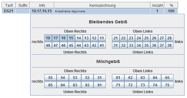 Alle Tarife die mit „D“ anfangen sind mit einem FDI-konformen 2-ziffrigen Zahnschema-Auswahlwekzeug versehen. Es können können beliebig viele Zähne gleichzeitig ausgewählt werden.