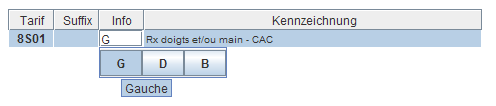 Für alle technischen Tarife aus der Radiologie-Gruppe (diese beginnen mit einer „8“ ) wird ein Auswahlwerkzeug zur Bestimmung der Lateralität angeboten: G - „gauche“, D - „droite“, B - „bilatéral“