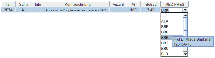 Die MED.PRES Spalte (= „médecin prescripteur“) soll immer dann ausgefüllt werden, wenn die hier aufgeführte Leistung von der primären Leistung eines anderen Arztes abgeleitet wurde. Z.B. muss diese Spalte vom Anästhesisten für alle Anästhesie-Leistungen angegeben werden, die einen A-Suffix bekommen (Anästhesie-Leistung = Primärleistung + Suffix A). In diesem Fall muss der Erbringer der Sekundärleistung den CNS-Code des Erbringers der Primärleistung auf der Rechnung vermerken. Gleiches gilt für die Operationsassistenz (Suffix P)