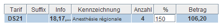 Diese Spalte zeigt den Betrag der Leistung an, sobald der Tarif-Code ausgewählt wurde. Dabei wirken sich Modifikatoren wie Suffixe, Anzahl und % sofort nach Bestätigen durch TAB auch auf die Höhe des Betrages aus. Des weiteren kann man auch einen Betrag komplett manuell erfassen, bei gleichzeitiger Beibehaltung aller Modifikatoren. Dazu klickt man einfach mit der Maus in die Betrags-Spalte und gibt per Tastatur einen neuen Wert ein. Dieser ersetzt den ursprünglich berechneten Wert und wird auch nicht mehr durch Änderung der Modifikatoren beeinflusst. Die Sonderstellung des manuell erfassten Betrages wird durch Rotfärbung der entsprechenden Betrags-Felder angezeigt.