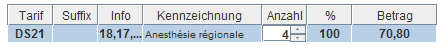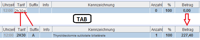 Wählen Sie den oder die Suffixe aus, die für diese Leistung in Frage kommen. Betätigen Sie die Enter-Taste um die Auswahl zu bestätigen. Je nach den ausgewählten Suffixen wird sich auch der Betrag des Tarifes anpassen.