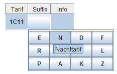 Durch Betätigen der Return oder Tab Taste wird der Code auf Gültigkeit überprüft und übernommen (gültig sind alle Codes die in der Nomenklatur als Tarife eingetragen sind) Ungültige Codes werden sofort wieder gelöscht. Desweiteren wird bei gültigen Codes auch der Betrag berechnet und gesetzt (siehe weiter unten), sowie die Suffixe vom eigentlichen Code getrennt und in das dafür vorgesehen Suffix-Feld gesetzt.