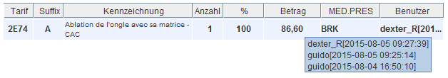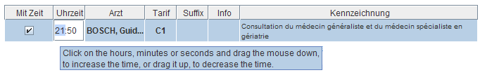 In verschiedenen Fällen ist es wünschenswert, die Uhrzeit der Erbringung einer Leistung zu erfassen, zum Beispiel wenn eine Leistung nachts erbracht wurde, oder um anzugeben, dass mehrere Leistungen zur gleichen Session (= Operationsfeld oder „champ opératoire“) gehören. Das kann nämlich Auswirkungen auf die Berechnung des Betrages haben, sofern der Session-Modus aktiviert wurde. Dazu kreuzen Sie zunächst das Kästchen „Mit Zeit“ an und geben danach die Uhrzeit links davon ein.