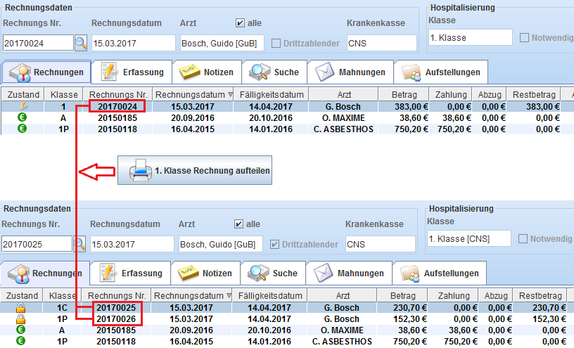 Mit dieser Funktion kann man veranlassen, dass eine Rechnung der 1. Klasse CNS in zwei getrennte Rechnungen aufgeteilt wird. Normalerwesise erfolgt diese Aufteilung beim Ausdrucken von Rechnungen, da erst dann garantiert ist, dass die Rechnungen vollständig sind und nicht mehr verändert werden. Die Funktion ist nur für Rechnungen der 1. Klasse mit dem Versicherer CNS ausführbar weil sie nur für diese Rechnungen sinnvoll ist.