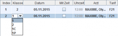 Die Auswahl einer Tarifzeile wird zum Löschen der Zeile benötigt. Darüberhinaus werden beim Einfügen einer neuen Tarifzeile wichtige Daten aus der aktuell ausgewählten Zeile übernommen - Klasse, Datum, Uhrzeit, Arzt - und die Zeile selber wird dirkt unter der ausgewählten einsortiert. Gleiches gilt auch für alle mit einer Rechnungsvorlage eingefügten Tarife.