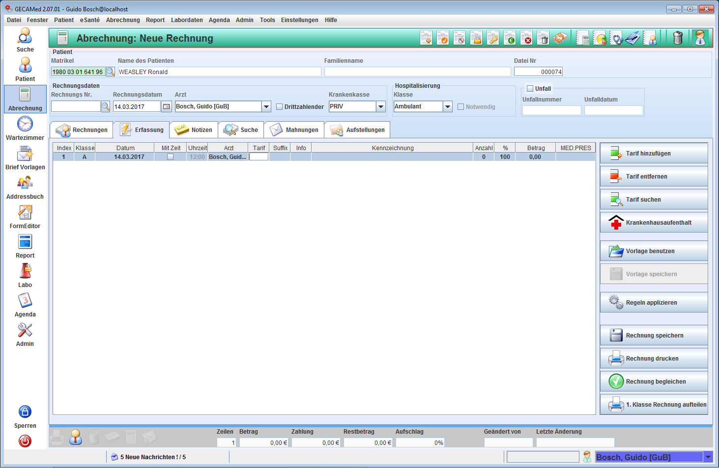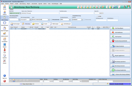 Beim Aufruf der Funktion wechselt das Abrechnungsmodul in den Modus Erfassung. In diesem Modus kann eine neue Rechnung für den aktuellen Patienten zusammengestellt werden.