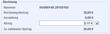 Rechnungen welche aus Arbeitsunfällen oder Krankenhausaufenthalte hervorgehen werden in der Regel von einer drittzahlenden Krankenkasse übernommen. In verschiedenen Fällen kann es aber vorkommen daß nicht der komplette Betrag erstattet wird. Damit die Rechnungen aber trotzdem korrekt verbucht werden kann, erlaubt das Feld Abzug dieser Differenz Rechnung zu tragen. Angenommen, im Falle unserer Beispielsrechnung hätte die drittzahlende Kasse nur 30,00 Euro überwiesen, dann würden wir im Feld Abzug die fehlenden 8,60 Euro eintragen.