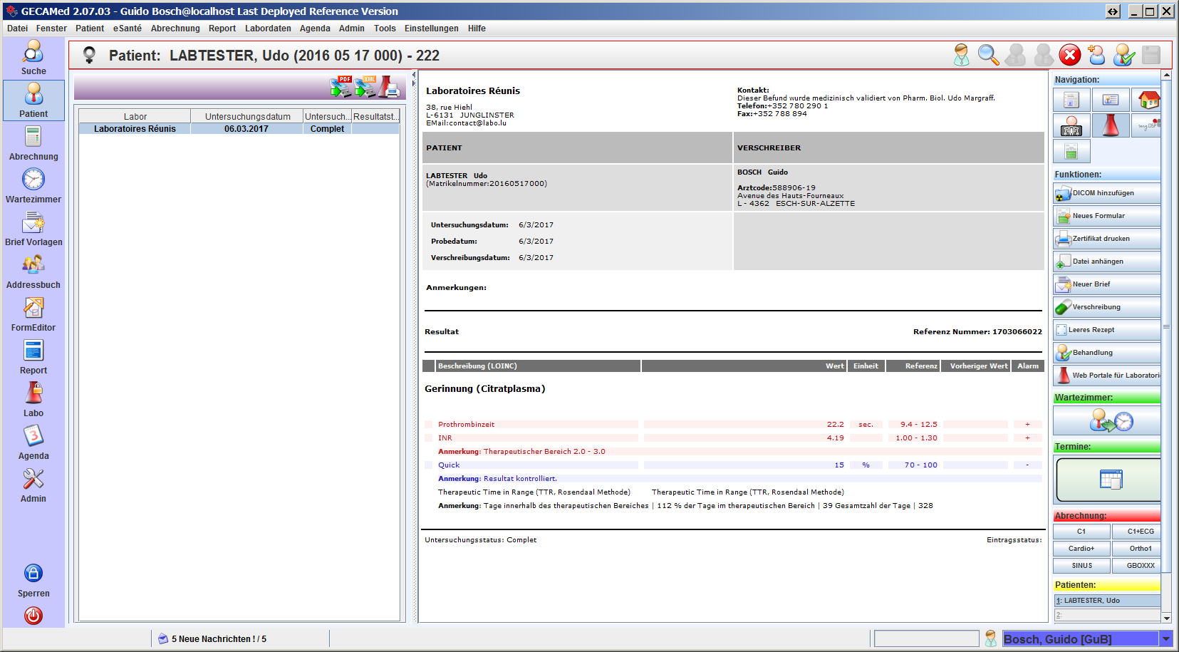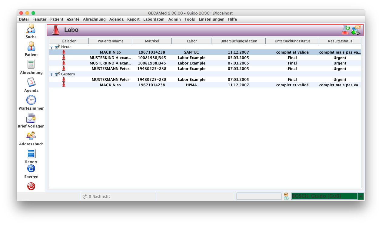 Alle Laborergebnisse des ausgewählten Arztes werden im Labo-Modul angezeigt, und zwar gruppiert nach Zeitpunkt des Herunterladens (neuste Resultate oben).