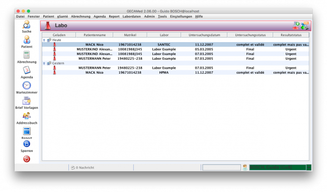 Sie können Ihr GECAMed System mit dem Labo-Server synchronisieren. Dabei werden neue Ergebnisse heruntergeladen. Um Laborergebnisse herunterzuladen, müssen Sie mit einen Benutzer eingeloggt sein, der die Rolle „Laborresultate herunterladen“ besitzt.