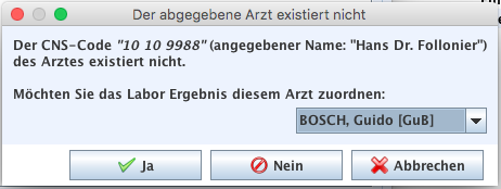 Falls der verschreibende Arzt des Resultates nicht mit dem aktuell ausgewählten Arzt in GECAMed übereinstimmt, erscheint folgender Dialog: