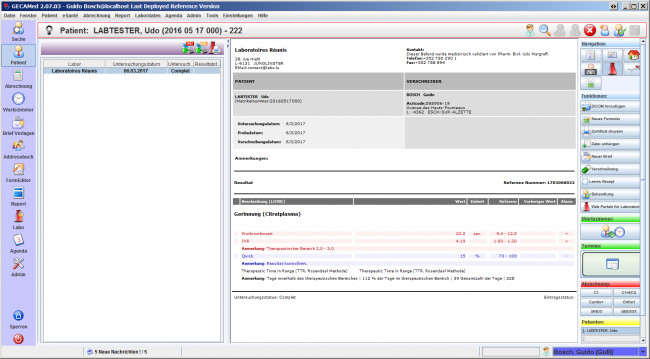 Sie können Laborergebnisse aus dem Labo-Modul, der Patienten-Historie oder der Labo-Ansicht heraus einsehen. Doppelklicken Sie dazu einfach in einer diesr Ansichten auf das gewünschte Ergebnis, und GECAMed springt dann in die Labo-Ansicht (wenn Sie sich nicht schon in dieser befinden). Hier kann der ausgewählte Labo-Bericht mit allen Einzelheiten eingesehen werden.