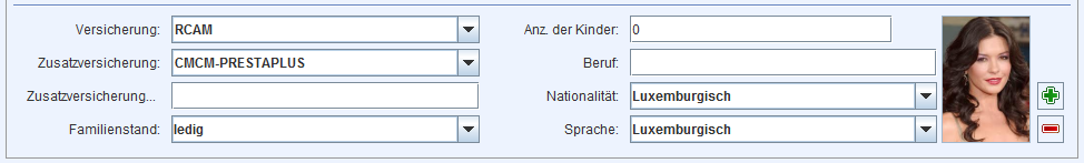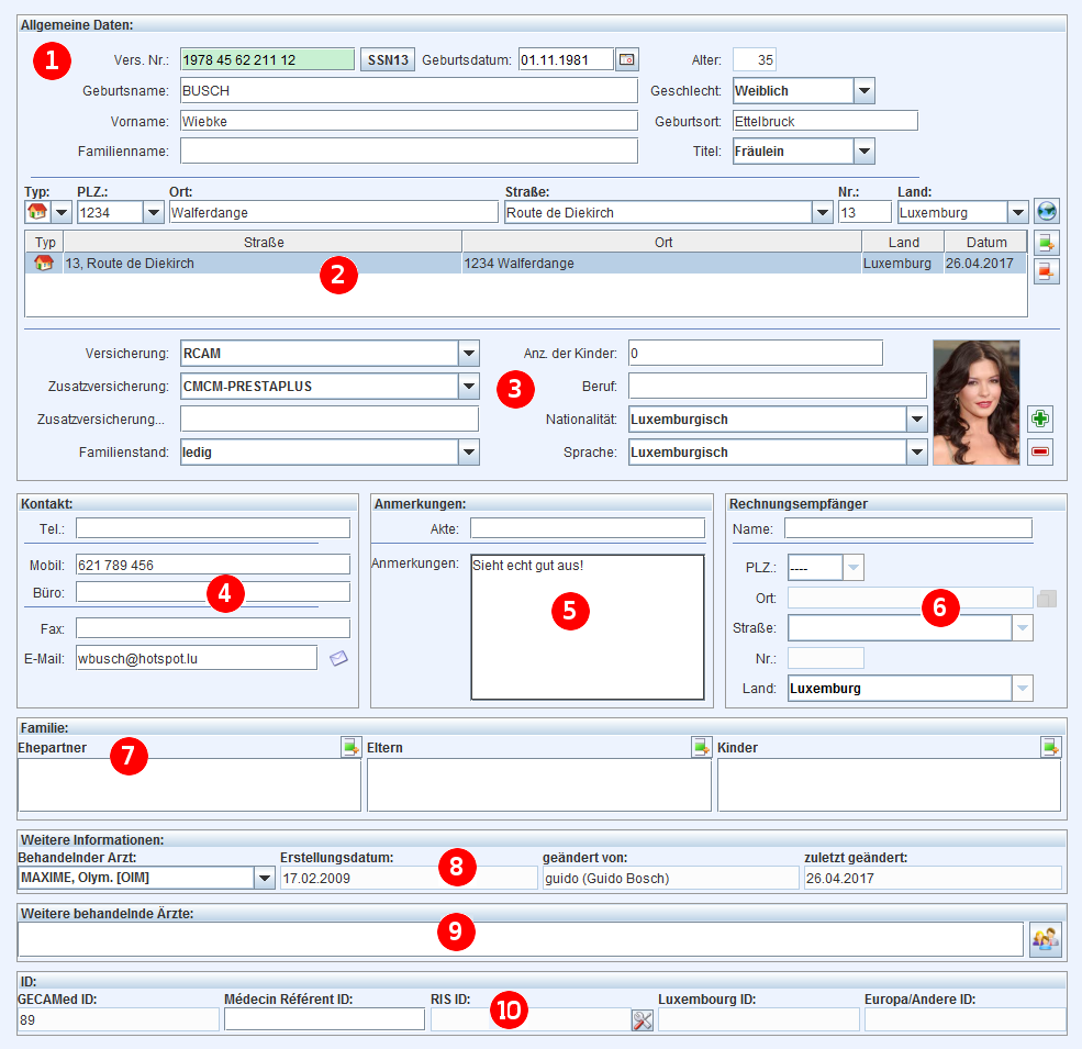 Bereich drei befasst sich mit zusätzlichen Informationen über den Patienten. Wählen Sie aus allen verfügbaren Krankenversicherungen und Zusatzversicherung aus. Diese Angaben sind wichtig um korrekte Rechnungen zu erstellen. Weitere informationen zu den in Luxemburg zugelassenen Krankenkassen finden sie hier.