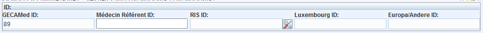 Patienten Identifikatoren, wie die GECAMed ID, die ID des médecin référent, die RIS (oder HIS) ID, sowie weitere. Nur die ID médecin référent kann aktuell händig ausgefüllt werden. Die HIS/RIS ID wird bei der Anbindung an ein HIS/RIS System automatisch von GECAMed verwaltet. Die letzten beiden Felder werden zur Zeit nicht genutzt.