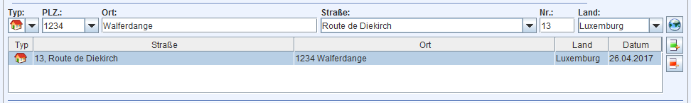 Die Adresseingabe in GECAMed ist durch eine komplette Liste aller Postleitzahlen, Orten und Straßen in Luxembourg relativ einfach. Die Eingabe der Postleitzahl füllt die Felder Ort und Straße automatisch aus. Falls es für diese Postleitzahl mehrere Straßen gibt, kann die entsprechende aus dem Dropdown-Menu ausgewählt werden. Alternativ kann über die unterstützte Eingabe des Ortes, der Straße und der Hausnummer die Postleitzahl vervollständigt werden.