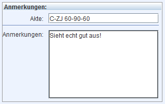 In diesem Bereich kann man sowohl einen Aktenvermerk eintragen (beispielsweise die Nummer einer Papierakte), als auch eine beliebige Textnotiz hinterlegen.