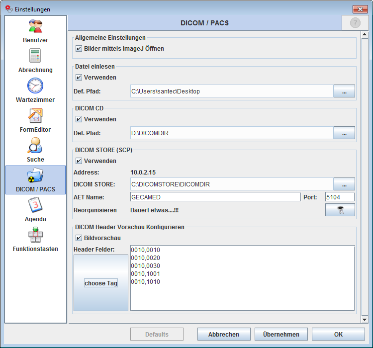 Aus technichen Gründen werden die DICOM Einstellungen auf der Ebene des Benutzers vorgenommen, obwohl diese, je nach Einsatz, eher an den Arbeitsplatzrechner als an den Benutzer gebunden sind. Ein typisches Einsatz Scenario ist z.B. ein Behandlungszimmer mit einem DICOM Gerät und einem GECAMed Arbeitsplatz. Werden die DICOM Funktionen von mehreren Benutzern genutzt müssen die Einstellungen entsprechend für alle Benutzer separat eingetragen werden.