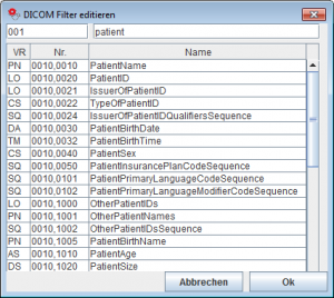 DICOM Header Vorschau Konfigurieren: Der DICOM Dialog bietet an vielen Stellen eine Vorschau der gewählten Bilder inclusive Headerdaten. Die in der Vorschau gewünschten Felder des DICOM-Headers können in den Einstellungen einfach zeilenweise getrennt eintragen oder mithilfe eines Auswahldialoges (choose Tag) hinzugefügt werden. Weiterhin kann man im Tag-Auswahldialog die Liste der verfügbaren Headerdaten nach Nummer und Name filtern. http://dicomiseasy.blogspot.lu/2011/10/introduction-to-dicom-chapter-1.html