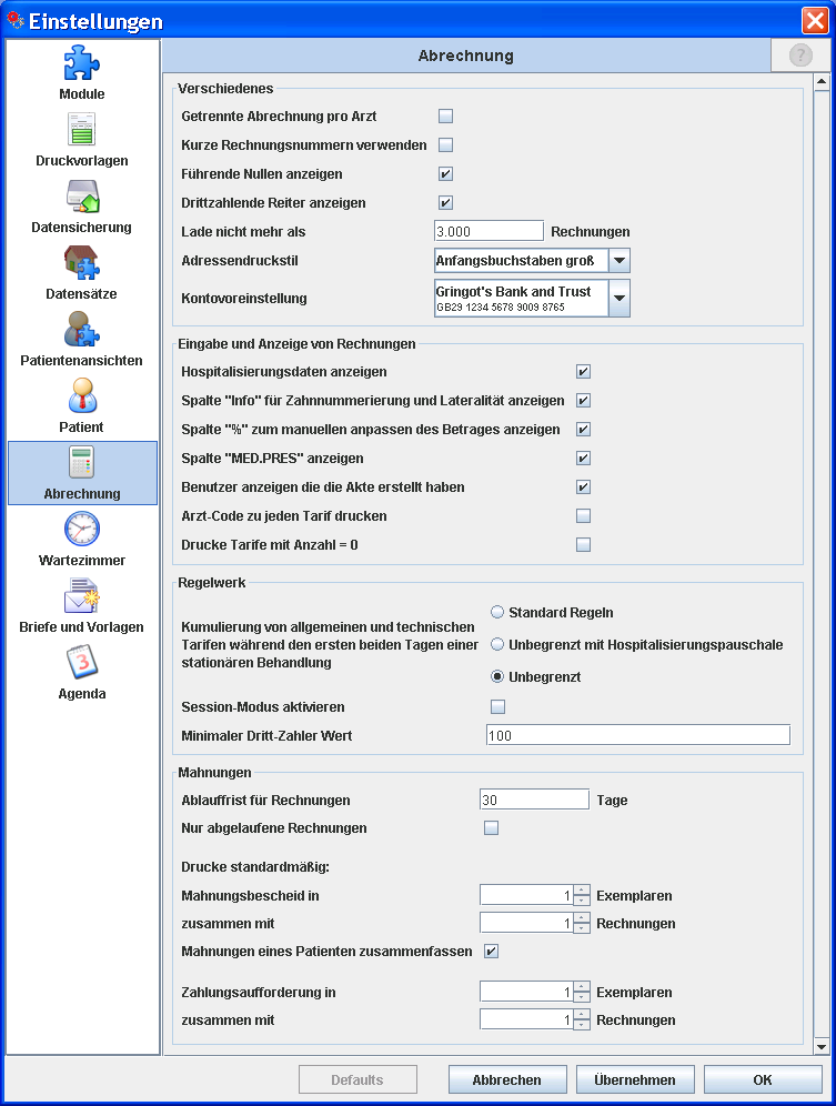 Zur besseren Übersichtlichkeit sind die verschiedenen Einstellungen des Abrechnungsmoduls in einzelne thematische Gruppen untergliedert.