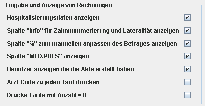 Die Option bestimmt ob der zu jedem Tarif intern abgespeicherte Arzt auf der Rechnung mit ausgedruckt wird oder nicht (Spalte "Arzt"). Dabei wird der CNS-Code des Arztes ausgedruckt, nicht dessen Name.