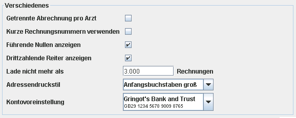 Diese Option dient dazu, die Anzahl der zu ladenden Rechnungen einzuschränken. Wird bei einem Vorgang diese Anzahl überschritten, so wird der Benutzer darüber in Kenntnis gesetzt und kann dann selber entscheiden, ob er den Vorgang abbrechen oder fortsetzen möchte. Diese Einschränkung ist für Rechner mit geringem Arbeitsspeicher oder kleiner Leistung wichtig. Der vorgegebene Standardwert von 500 ist sehr konservativ und kann in der Regel auf 5000 hoch gesetzt werden.