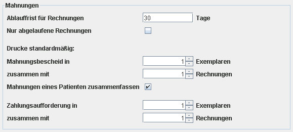 Diese Einstellungsgruppe definiert die Anzahl der Dokumentkopien welche pro Mahnung gedruckt werden. Die hier angegebenen Werte werden im entsprechenden Druckdialog als Standardwerte vorgegeben, können aber vom Benutzer je nach Bedarf noch angepasst werden bevor der Druckvorgang startet. Zu beachten ist insbesondere die Option 'Mahnungen eines Patienten zusammenfassen'. Ist diese aktiviert so wird nur ein einziger Mahnungsbrief pro Patient gedruckt, auch wenn einzelne Patienten für mehr als eine Rechnung angemahnt werden. Dabei werden alle angemahnten Rechnungen für einen Patienten im Magnungsbrief in einer Liste zusammengefasst. Ist die Option nicht gesetzt so wird für jede Rechnung ein separater Mahnungsbrief gedruckt.