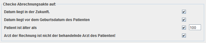 Diese Gruppe von Optionen aktiviert mehrere Plausibilitäts-Tests, die beim Erstellen der Rechnung bzw. beim Erfassen eines Tarif-Datums überprüft werden, sofern hier aktiviert. Falls die jeweilige Bedingung erfüllt ist, erscheint ein Dialog mit einer Warnung. Es wird jeweils geprüft ob