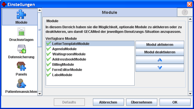 Hier kann man auswählen, welche funktionalen Module von GECAMed über die Modulleiste verfügbar gemacht werden, und in welcher Reihenfolge die entsprechenden Schaltflächen in der Modulleiste angezeigt werden sollen. Um GECAMed beim Starten und Initialisieren zu beschleunigen sollten alle nicht verwendeten Module vom Administrator deaktiviert werden.