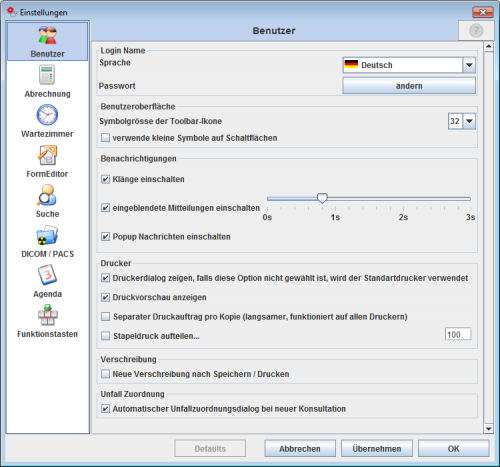 Die „Benutzer“ Gruppe in Dialogfenster der Benutzer-spezifischen Einstellungen dient zur allgemeinen Anpassung der GECAMed Anwendung an die Bedürfnisse de Benutzers. Diese sind wiederum aufgeteilt in „Login Name“, „Benutzeroberfläche“, „Benachrichtigungen“ und „Drucker“ (siehe Abbildung 11).