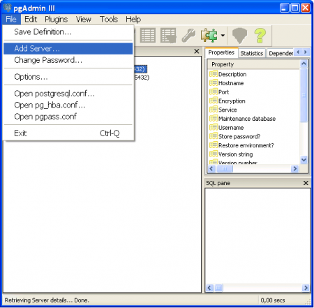 Der nächste Schritt besteht darin, pgAdmin mit der PostgreSQL Datenbank zu verbinden. Dazu startet man pgAdmin III und konfiguriert zunächst eine neue Datenbankverbindung.