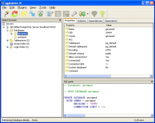 Nach dem Herunterladen und Installieren muss pgAdmin zunächst einmal an die GECAMed Kantenbank angeschlossen werden. Dies setzt voraus, dass eine funktionsfähige PostgreSQL Datenbank für GECMed installiert und konfiguriert ist. Sollte dies nicht der Fall sein, z.B. nach einem Disk Crash oder der Migration auf einen anderen Rechner, muss man zunächst einmal GECAMed komplett neu installieren. Dazu sollte unbedingt die gleiche GECAMed Version installieren, von der auch der zu Wiederherstellung verwendete Backup stammt. Im Allgemeinen ist das die zuletzt in der Arztpraxis benutzte Version, da von dieser auch die neuesten Backups stammen. Sie können Installer der wichtigsten sich im Umlauf befindlichen älteren GECAMed Versionen an folgender Stelle herunterladen.