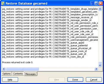 Nach der Restaurierung wird der „Messages“ Reiter aktiviert, der Details über den Verlauf der Restauration enthält. Optimalerweise sollten bei einer kompletten Restauration mit der 'Clean before restore' option keine Fehler was GECAMed Daten angeht auftreten, da ja die alte Datenbank zuvor entfernt wurde. Allerdings sind andere Fehler oder Warnings möglich, die jedoch normalerweise keine Probleme darstellen.