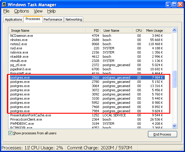 vlansantec049:~ santec$ ps -aux | grep postgre santec 25712 0.5 0.0 27376 420 p1 S+ 2:57PM 0:00.01 grep postgre postgres 1861 0.0 0.3 61376 2924 ?? S Fri11AM 0:42.35 /Library/PostgreSQL/8.3/bin/postgres -D /Library/PostgreSQL/8.3/data postgres 1862 0.0 0.0 32608 336 ?? Ss Fri11AM 0:26.98 postgres: logger process postgres 1864 0.0 0.8 61428 7956 ?? Ss Fri11AM 2:32.30 postgres: writer rocess postgres 1865 0.0 0.1 61376 576 ?? Ss Fri11AM 1:01.47 postgres: wal writer process postgres 1866 0.0 0.0 61536 492 ?? Ss Fri11AM 1:08.90 postgres: autovacuum launcher process postgres 1867 0.0 0.0 32768 432 ?? Ss Fri11AM 2:22.52 postgres: stats collector process postgres 25011 0.0 0.7 62620 7520 ?? Ss 11:30AM 0:01.43 postgres: gecamed gecamed 127.0.0.1(60446) idle postgres 25582 0.0 0.3 41484 2704 ?? SNs 2:16PM 0:00.75 /System/Library/Frameworks/CoreServices.framework/Versions/A/Frameworks/Metadata.framework/Versions/A/Support/mdimportserver postgres 21948 0.0 0.5 62056 5340 ?? Ss 7:35PM 0:02.14 postgres: gecamed gecamed 127.0.0.1(58942) idle
