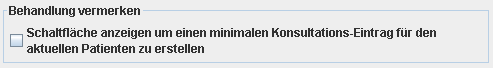 Im Bereich „Behandlung vermerken“ wird die Schaltfläche „Behandlung“ aktiviert und deaktiviert (siehe Abbildung), die einen S-Eintrag („Grund der Konsultation“) für den aktuellen Arzt erstellt. Das dient dazu, möglichst schnell und ohne speziellen Texteingaben einen Behandlungseintrag anzulegen. So kann z.B. die Sekretärin schnell eintragen, dass der Arzt einen Patienten behandelt hat, ohne dass der Arzt selber irgendetwas ausfüllen muss.