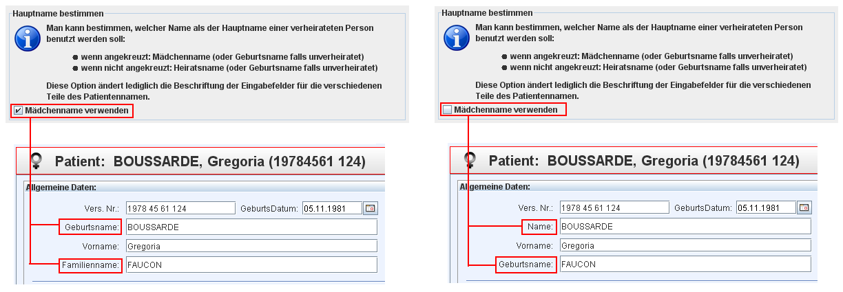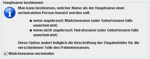 Im Bereich „Hauptname bestimmen“ kann man deshalb entschieden, ob das oberste Namensfeld in der Teilansicht PatientBasicAdminInfoPanel (welches ein Pflichtfeld ist) den Geburts- oder den Familiennamen des Patienten enthält. Das dritte Namensfeld enthält entsprechend den jeweils anderen Namen, oder nichts, falls der Geburtsname gleich dem Familiennamen ist. Diese Option ändert lediglich die Beschriftung der Felder und hat keinen Einfluss auf die Funktionalität.