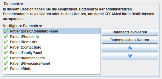 Im Bereich „Datensätze“ werden die Teilansichten der administrativen Patientenansicht aktiviert und deaktiviert und ihre Reihenfolge festgelegt. Zu diesen Teilansichten gehören: