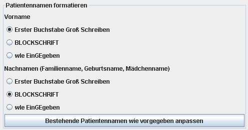 Desweiteren kann man mithilfe der Schaltfläche „Bestehende Patientennamen wie vorgegeben anpassen“ alle bereits existierenden Patientenamen den angegeben Optionen entsprechend nachträglich formatieren.